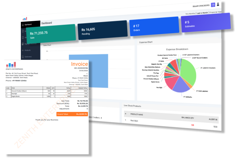 Generate invoices, track payments, manage stock, and gain insights — all in one powerful platform.